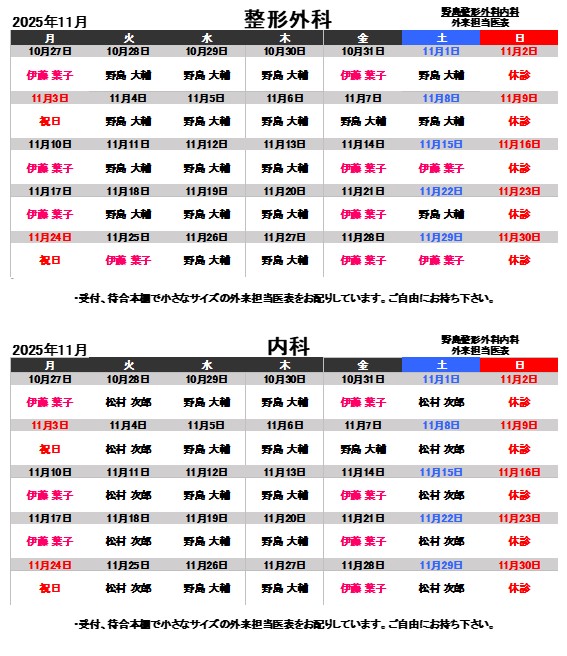 松村祐子医師から野島大輔医師に院長が引き継がれましたが、現在は、野島大輔医師、伊藤葉子医師、松村次郎医師の3人体制で、整形外科・リハビリテーション科・内科の診療に当たっておりますのでご安心下さい。